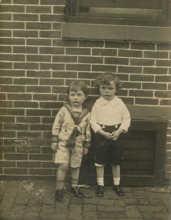 Group portrait showing two little boys, about four or five years old and likely brothers, standing in front of a brick house in Philadelphia. The smaller boy on the left has straight hair and is wearing a sailor suit. His image is somewhat blurred. The taller boy on the right has curly hair and wears a white shirt to which his dark short pants are buttoned.