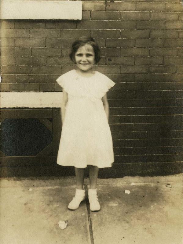 Portrait of little girl, about six years of age, standing in front of a brick house in Philadelphia. She wears a pretty white dress with a broad cape-ruffle around her shoulders, white socks and shoes. She smiles at the photographer. The image is rather blurred.