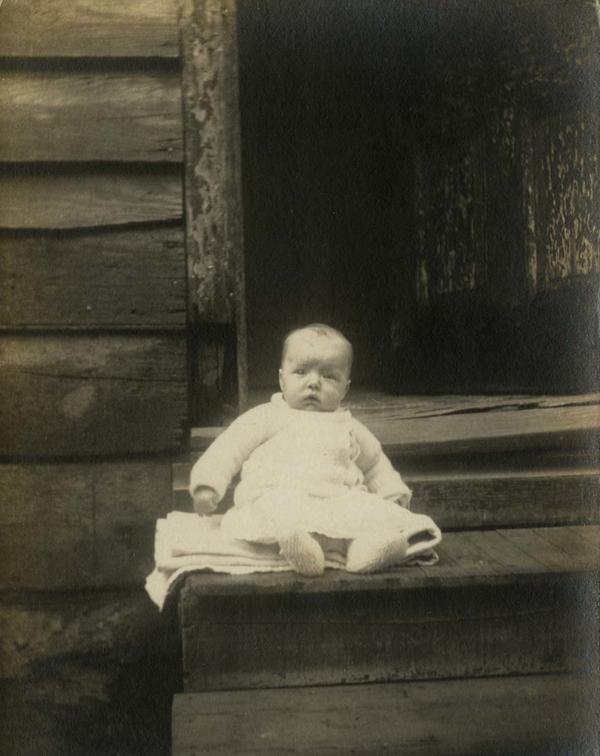 Portrait of a nicely dressed baby sitting on a folded blanket on the wooden steps of a wooden house in Philadelphia. The opened wooden door and trim is in need of paint. The baby, wearing knitted booties, appears to have just awakened.