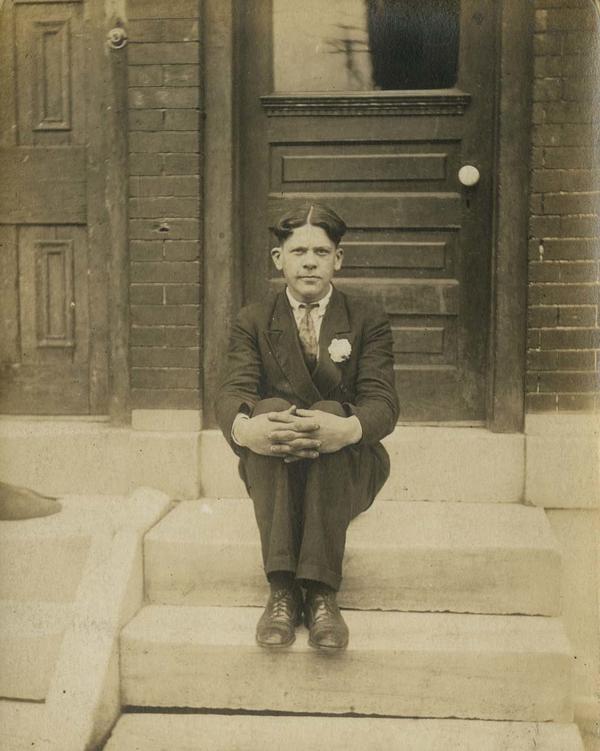 Portrait of a young man wearing a suit, tie, and a carnation in his lapel sitting on marble steps in front of a door in Philadelphia. His thick hair is parted in the middle and combed down. He sits on the top marble step, his hands clasping his knees. The marble steps have been kept clean.