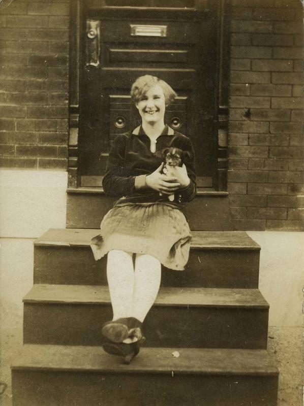 Portrait of a smiling, well dressed young woman with a puppy in her arms sitting on wooden steps in Philadelphia. She wears a dark velvet blouse with a silk pleated skirt, white stockings and dark high heels. Behind her is a carved wood door and brick house.