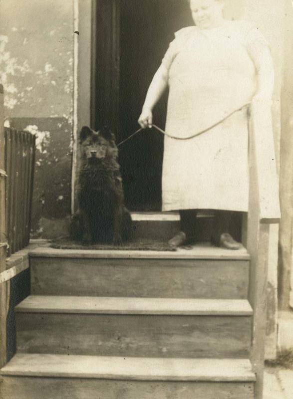 Portrait of an overweight woman in a cotton housedress standing with her dog on the wooden steps of a house in Philadelphia. She has the dog on a leash. The dog sits quietly, posing for the photographer.