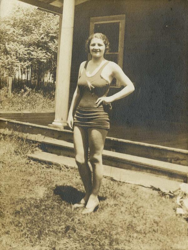 Portrait of a young woman with dark wavy hair posing in her woolen bathing suit in front of a house in the country. She also wears high heeled leather shoes. She stands in the grass in front of the porch of a wooden house. In the background is some other greenery.