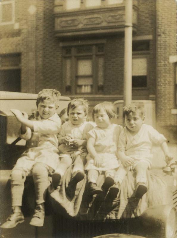 Group portrait showing four small children sitting on a quilt or blanket on the hood of an automobile or truck in Philadelphia. They are dressed in casual clothing. Three of the four are squinting because of the glare of the sunlight. One of the children holds onto the hood ornament. The eyes of an adult holding on to one of the children can be seen behind them. In the background is an attractive brick row house.