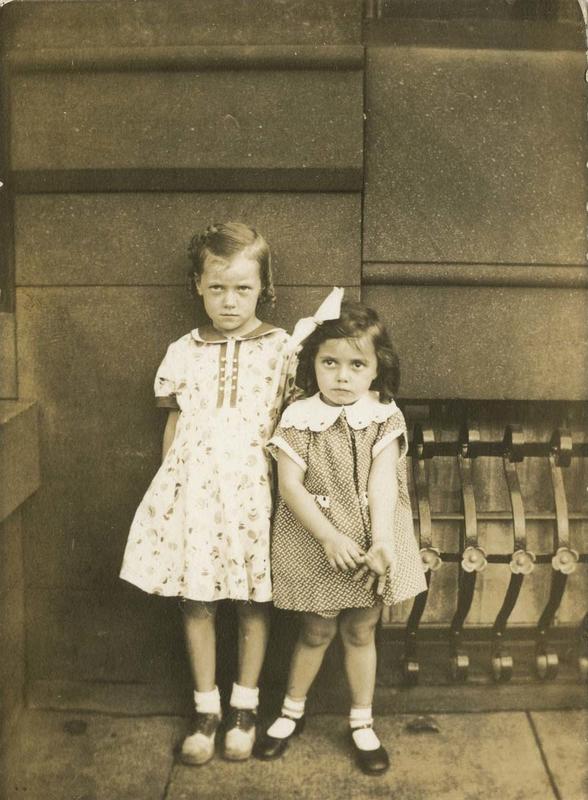 Group portrait showing two little girls standing in front of a stone building in Philadelphia. They are both wearing good dresses and have their hair combed. The bigger girl wears a flowered dress with saddle shoes. The smaller girl wears a big bow in her hair, a patterned dress, and patent leather shoes. A decorative iron window grate is behind them.