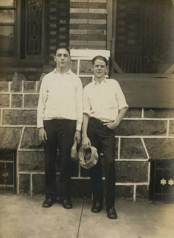 Group portrait showing two young men with caps in their hands standing in front of a stone porch in Philadelphia. They wear slacks and shirts and have their hair neatly combed. Stained glass windows are visible in the house behind them.