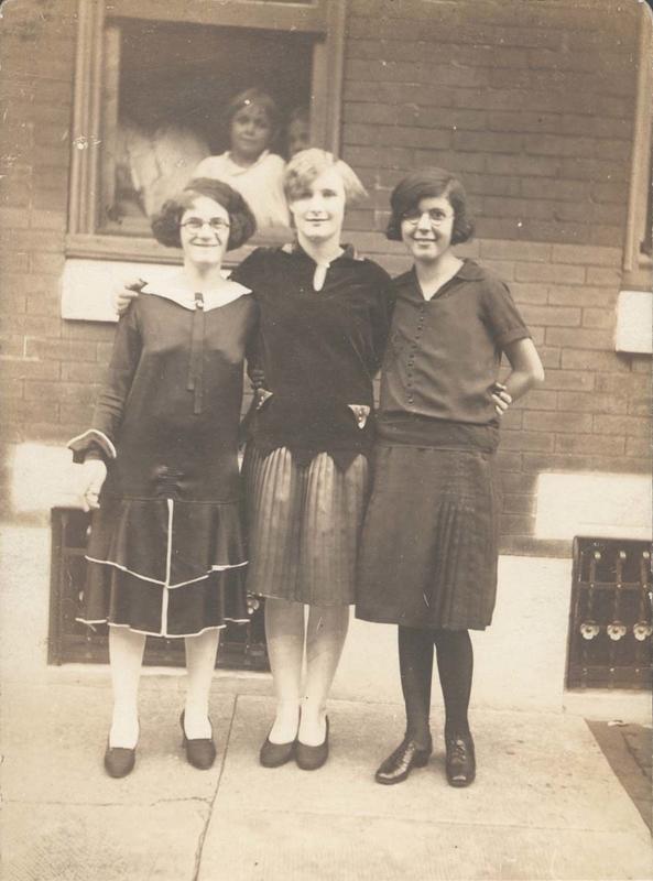Group portrait showing three young women, dressed up in their best dresses with stockings and dress shoes, standing in front of the window of a brick house in Philadelphia. Behind them, from inside the house, two small children and an adult can be seen looking out the window at the activity on the sidewalk. Two of the women wear glasses.
