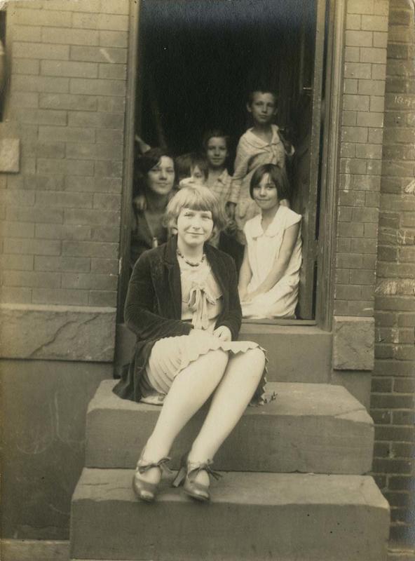 Group portrait showing a teenage girl sitting on the brownstone step of a house in Philadelphia. She is in her "good" dress covered by a short velveteen jacket and wears white stockings and high heels tied with a bow. Behind her in the doorway is another teenage girl and four little girls, all in summer clothes. They all smile at the photographer. The outside brick wall is smeared with graffiti.