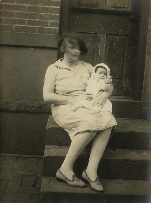 Group portrait showing a woman holding an infant sitting on worn brownstone steps in Philadelphia. While the woman wears a sleeveless dress, the child wears a cap and long-sleeved coat or jacket. The image of the woman is blurred as the wind blows her hair about. The door behind them is in dire need of paint.