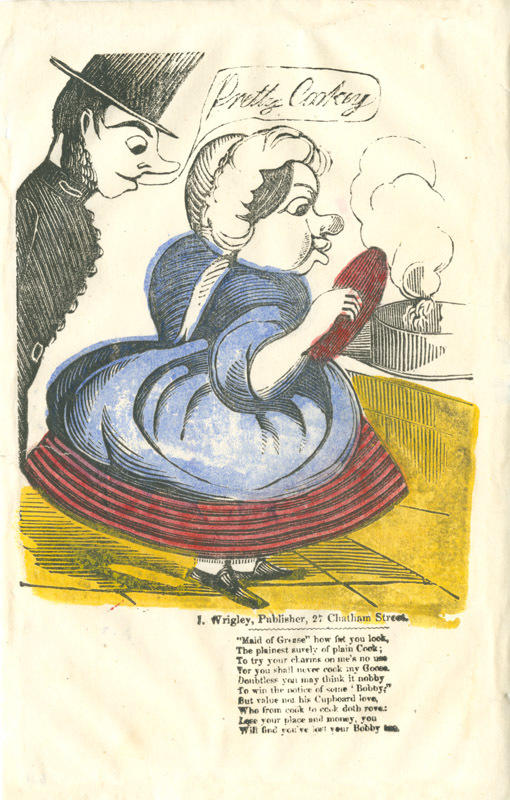 Text: "Maid of Grease" how fat you, / The plainest surely of plain Cook; / To try your charms on me's no use / For you shall never cook any Goose. / Doubtless you may think it nobby / To win the notice of some 'Bobby;' / But value not his Cupboard love, / Who from cook to cook doth rove; / Lose your place and money, you / Will find you've lost your Bobby too.