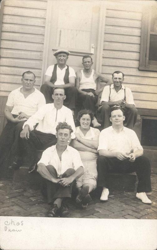 Group portrait showing seven men, all in shirtsleeves, except one who is in his undershirt and barefeet, sitting around a smiling woman who wears a checked summer dress in front of a wooden house in Philadelphia. One man wears a workman's cap. One man holds a cigarette in his hand; another, a cigar. The house appears to be in good repair. The sidewalk is brick in the herringbone pattern.