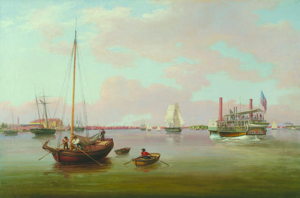 Philadelphia landmarks in the painting include Spark’s Shot Tower on the left, the steeple of Christ Church in the center, as well as the Old Navy Yard. Anchored in front of the Navy Yard is what is believed to be the U.S.S. Pennsylvania, which is thought to be the largest sailing man-of-war ever built in the United States. At the right is the steamboat Robert Morris, built in 1830.