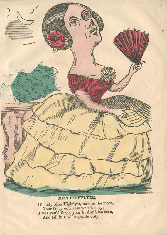 Text: O! lofty Miss Highflyer, nose to the moon, / Your fancy outrivals your beauty; / I fear you'd forget your husband too soon, / And fail in a wife's gentle duty.