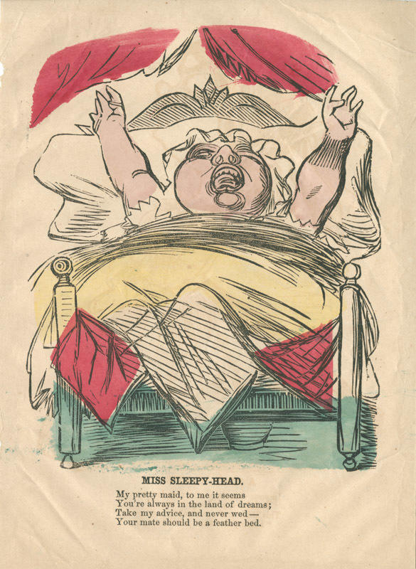 Text: My pretty maid, to me it seems, / You're always in the land of dreams; / Take my advice and never wed -- / Your mate should be a feather bed.