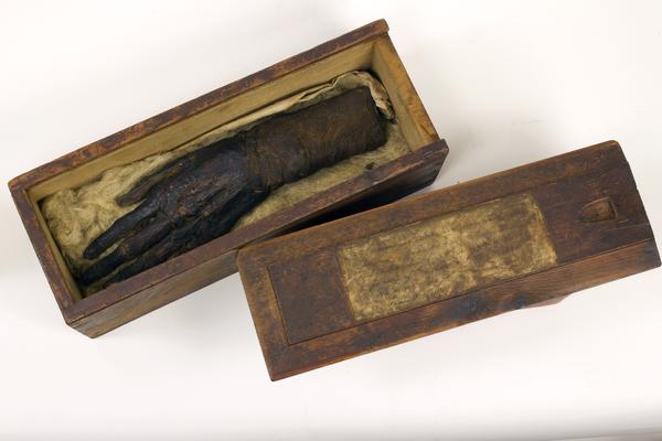 On the top of the box is a label in Francis Hopkinson's hand that reads: “Woman's Hand taken from an Egyptian Mummy: presented