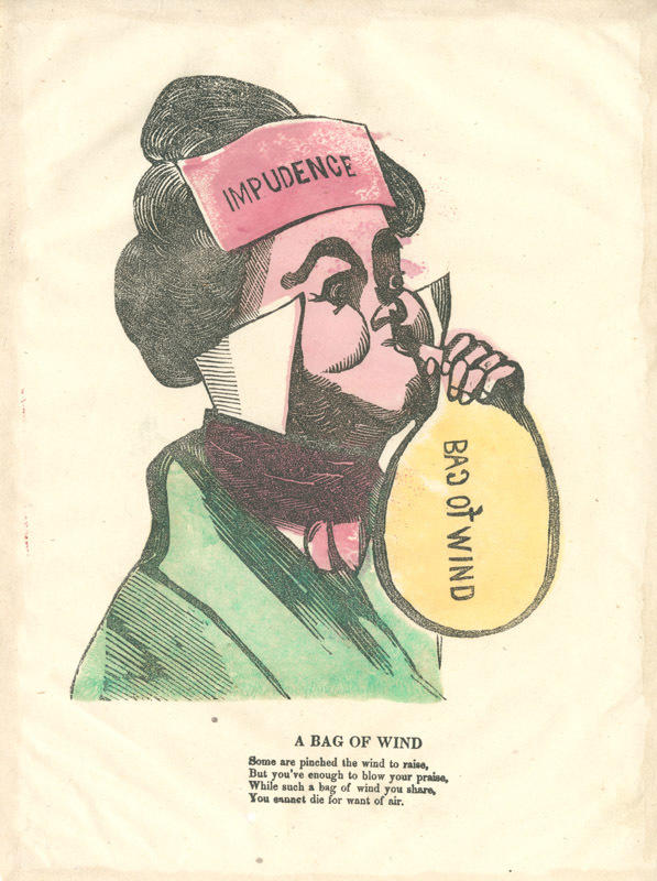 is labeled "impudence", and he sucks air out of a yellow bag labeled "bag of wind."