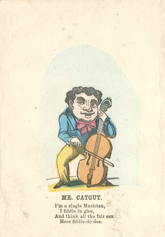 A man plays a large fiddle. "Catgut" means a thick cord made from sheep intestines used for violin strings. The valentine criticizes the fiddler for disrespecting women.