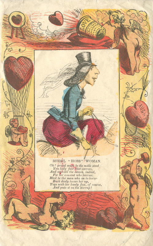 The valentine shows a woman riding sidesaddle. The border shows cupids and hearts; one cupid shoots a heart out of a thimble