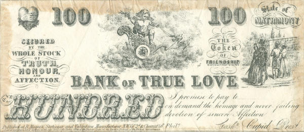 Text: Secured by the Whole Stock of Truth, Honour, and Affection / The Token of Frienship/ The Bank of True Love / One Hundred