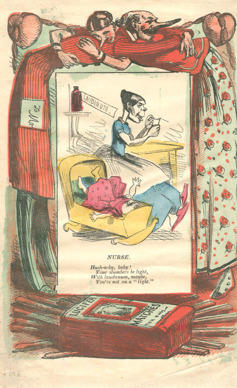 A simian nurse sits in a chair next to a baby in a craddle. A bottle marked "laudinum" [i.e. laudanum] is on the shelf above her, and she threads a needle. The border features a woman embracing a man; the pair resemble Commedia dell'arte characters. At the bottom is a pack of matches marked "Lucifer's matches."