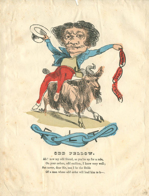 A man rides a ram and holds a banner that reads "Friendship, Love, Truth," the motto of the Odd-Fellows society. The initials