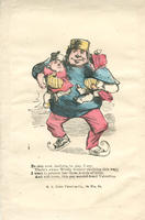The valentine shows a large man skating as he holds two children in his arms. The child facing front resembles a bull-dog. The verse mocks Irish accents.