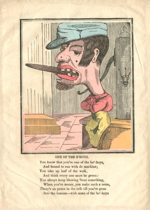 Text: You know that you're one of the bo'hoys, / And bound to run with de machine; / You take up half of the walk, / And think