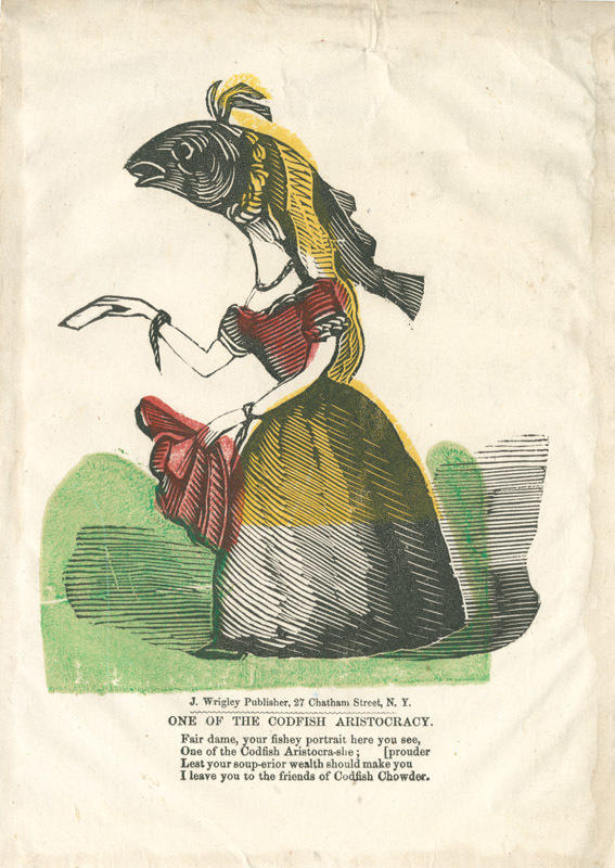 A woman has a codfish for a head and wears a gown. She holds out a slip of paper and a fan. "Cod-fish aristocracy" was a derogatory term for New Englanders whose family wealth originated in maritime businesses.