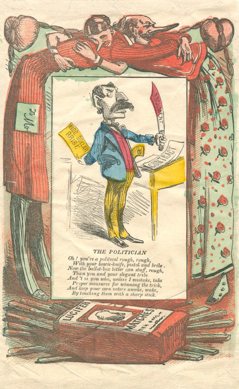 The politician hides a bill marked "$100 bribe" behind his back, and he holds a bloodied knife marked "argument" in front of him. He stands at table with a contract on it. The border features a woman embracing a man; the pair resemble Commedia dell'arte characters. At the bottom is a pack of matches marked "Lucifer's matches."