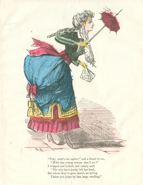 Text: "Pray, what's the matter," said a friend to me, / "With that young woman that I see?" / I stopped and looked and calmly said, / "The wits have surely left her head, / But where they're gone there's no telling / Unless you judge by large swelling."