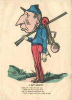 Slouching, the raw recruit, wearing a Union uniform, carries a gun and a rucksack. |