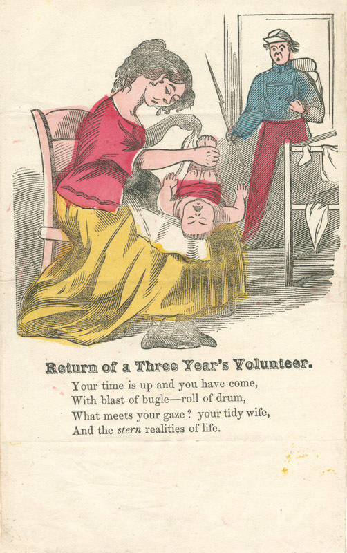 A Union soldier stands near a doorway and observes his wife changing his child's diaper. The valentine suggests that the realities of domestic life are shocking after military service.