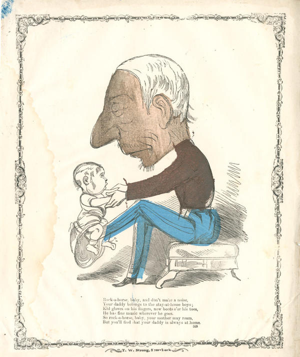 Text: Rock-a-horse baby, and don't make a noise, / Your daddy belongs to the stay-at-home boys; / Kid gloves on his fingers, new boots o'er his toes, / He has fine music wherever he goes. / So rock-a-horse, baby, your mother may roam, / But you'll find that your daddy is always at home.