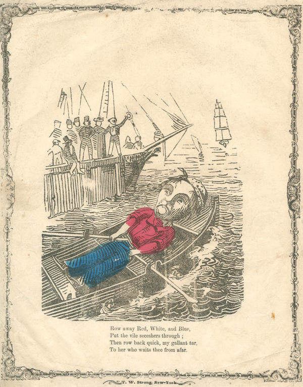 Text: Row away, Red, White, and Blue, / Put the vile seceshers through; / Then row back quick, my gallant tar, / To her who waits thee from afar.