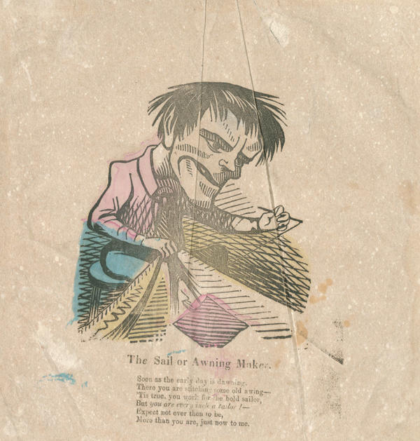 Text: Soon as the early day is dawning, / There you are stitching some old awing [i.e., awning]-- / 'Tis true, you work for the bold sailor, / But you are every inch a tailor! -- / Expect not ever then to be, / More than you are, just now to me.