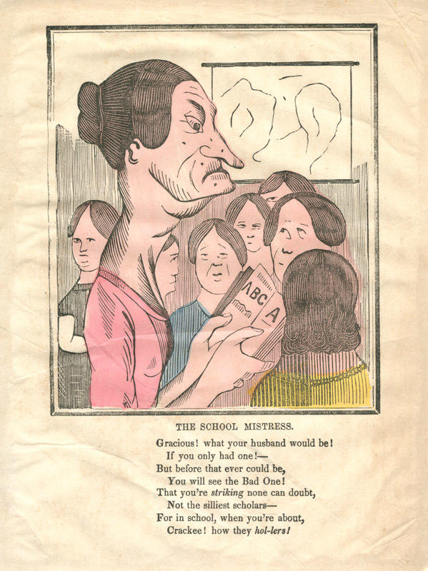 Text: Gracious! what your husband would be! / If you only had one!--- / But before that ever could be, / You will see the Bad One! / That you're striking none can doubt, / Not the silliest scholars--- / For in school, when you're about, / Crackee! how they hol-lers!