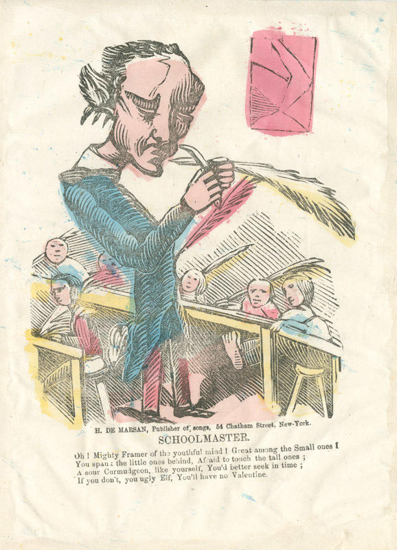 The thin schoolmaster sharpens his quill and looks away from the classroom of children. The valentine mocks him for targeting