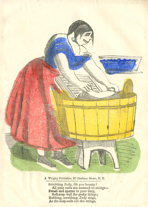 Text: Scrubbing Judy, Oh you beauty! / All your curls are steamed to strings -- / Swash and spatter in your duty, / Soft-soap well the pesky things; / Rubbing, scrubbing, Judy sings, / As the soap-suds out she wrings.