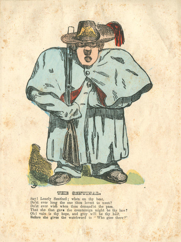 The Union sentinel holds a gun and wears a uniform that is too big for his frame, making him appear childish. The sender mocks