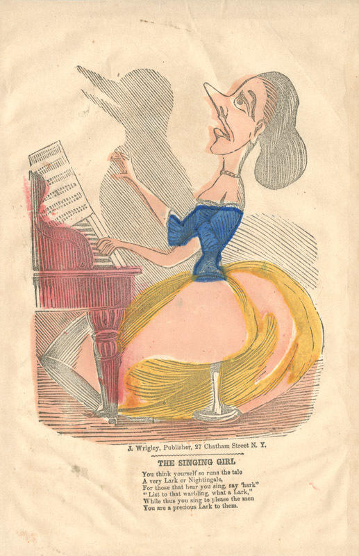 A woman sits at a piano singing, and her shadow looks like a bird. The valentine puns on the word "lark" to mock the recipient