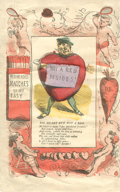 " 'Not a Red' Besides!" The text is a parody of Sheridan's "The Duenna." The border features matches, a heart-shaped beet,