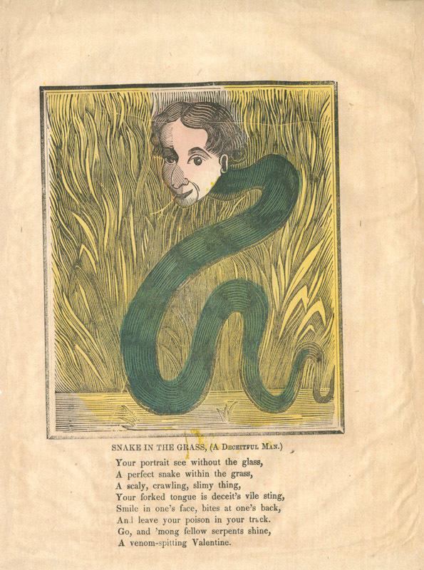 Text: Your portrait see without the glass, / A perfect snake within the grass, / A scaly, crawling, slimy thing, / Your forked tongue is deceit's vile sting, / Smile in one's face, bites at one's back, / And leave your poison in your track. / Go and 'mong fellow serpents shine, / A venom-spitting Valentine.