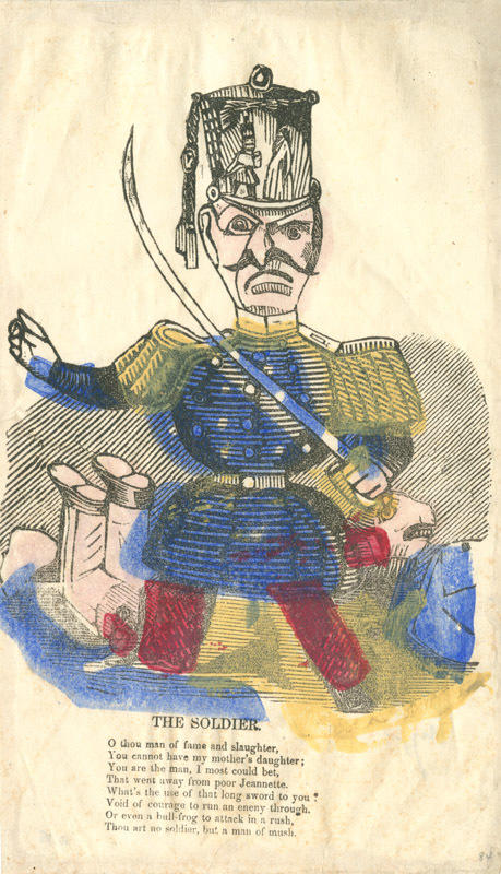 even a bull-frog to attack a rush, / Thou art no soldier, but a man of mush.