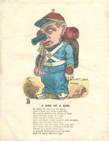 A Union soldier stands with closed eyes. His nose is a cannon, and he holds a rifle. Signed with a monogram: BB [?]. |