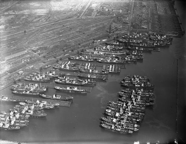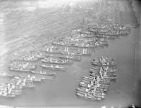 Aerial views of the shipyard at Hog Island in Philadelphia. Industrial buildings and sheds, railroad tracks and shipbuilding equipment can be seen from several angles and many boats and ships are docked in the harbor.