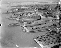 Aerial views of industrial piers on the Camden waterfront. Campbell's Soups pier and R.C.A.-Victor Talking Machine Company facilities are visible along with railroad tracks and other industrial facilities further south along the Delaware River.