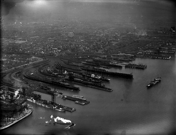 many of which served the coal trade. Large ships are visible on the river and portions of the city to the north and west of