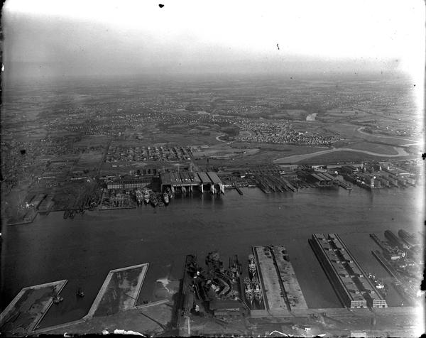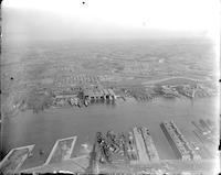 Aerial views of the New York Shipbuilding Corporation on the Camden, New Jersey waterfront along the Delaware River. The shipbuilding facilities can be seen from several angles in both close-up and distant views. Adjacent railroad tracks and neighborhoods are also visible and other parts of Camden can be seen in the distance. The company launched its first ship in 1901 and its last in 1967.