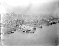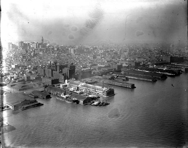 Piers, industrial facilities, railroad tracks, ships and ferries are visible as are portions of neighborhoods adjacent to