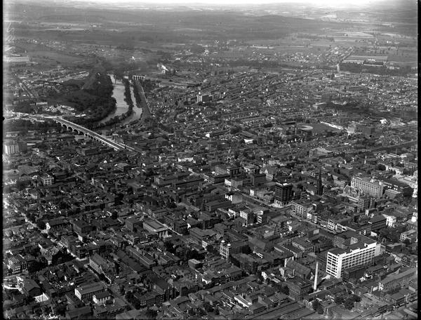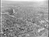 Aerial views of Reading, Pennsylvania show views of the greater downtown area, Mount Penn and bridges spanning the Schuylkill River. View (2711) from west to east along Penn St. with the Luden Mansion visible in the distance. View (2762) from souteast to northwest with Penn St. and the Schuylkill River visible. View (2784) shows downtown Reading from west to east. Probably taken September 12-16, 1922.